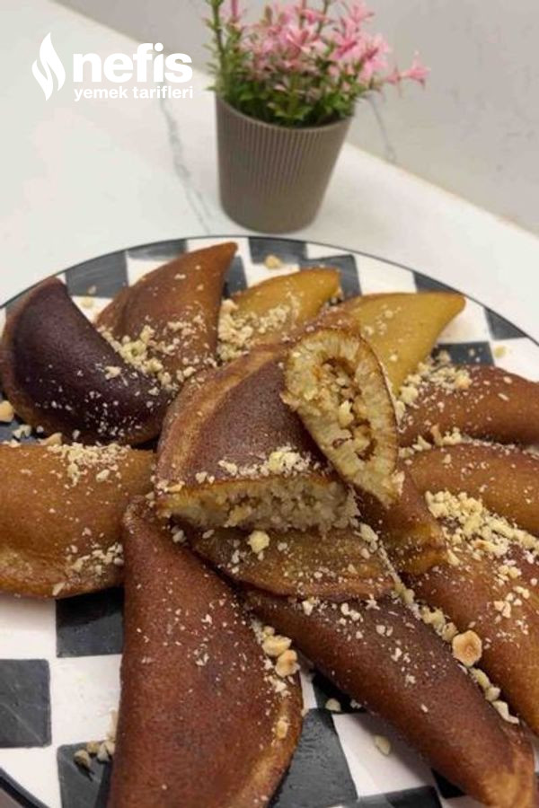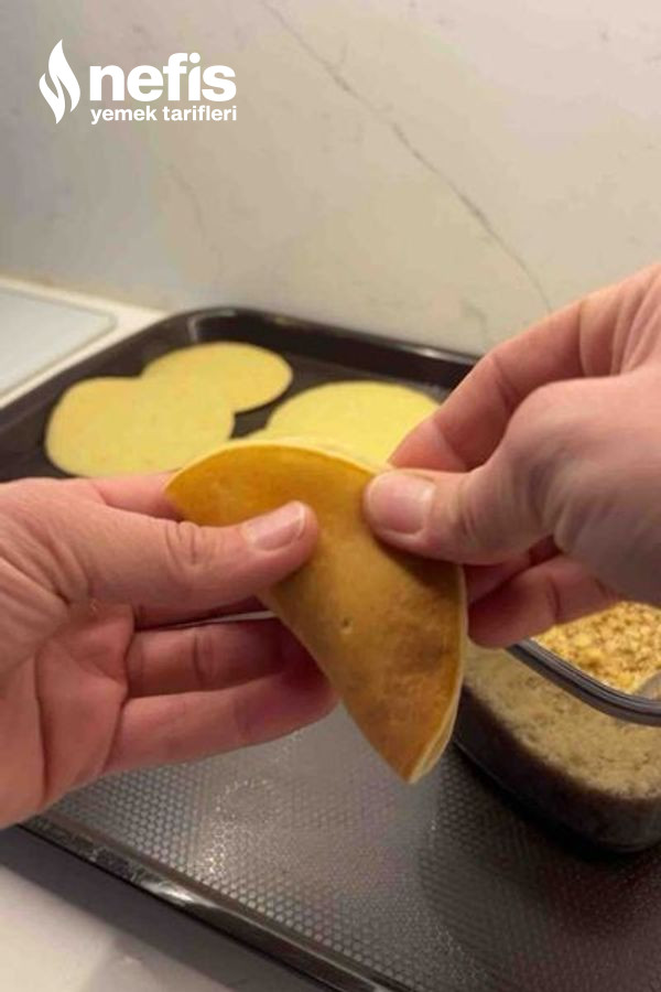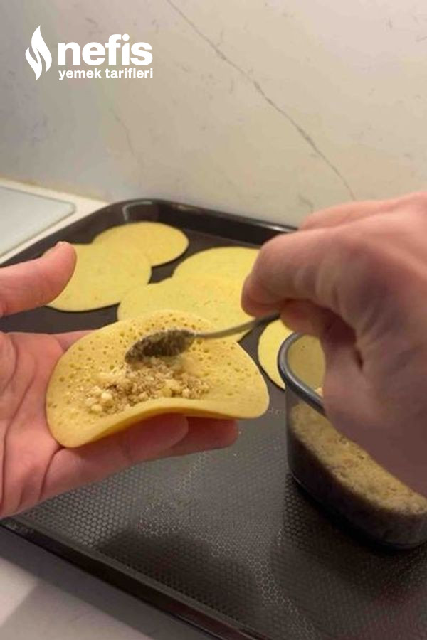 - Hamurun ortasına istediğiniz iç harçtan ekleyebilirsiniz. Ben ceviz kırığı tercih ettim ve hamurun ortasına ceviz kırıklarından ekleyip yarım ay halinde kapattım.