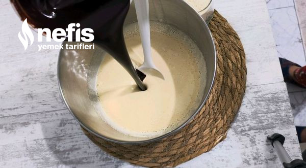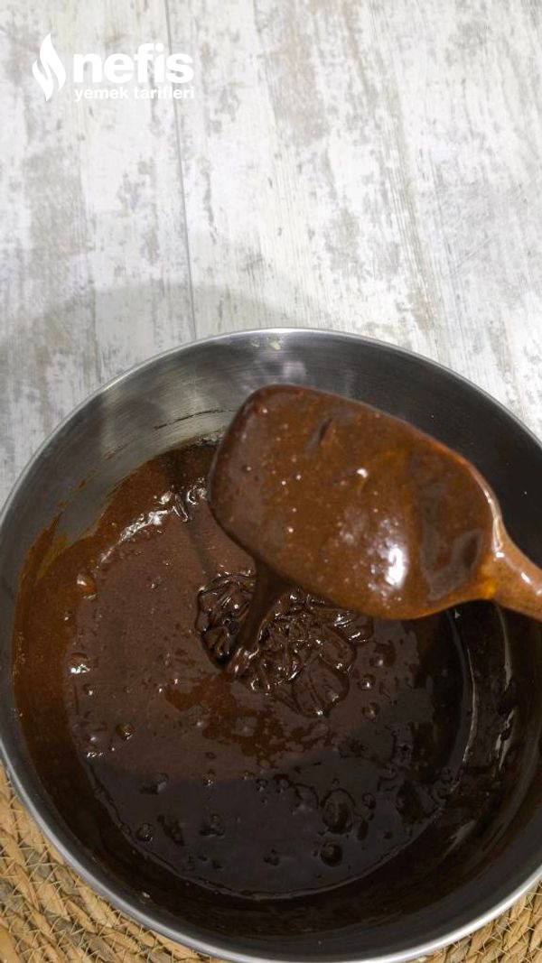 3. Çikolata sosu, un, vanilya ekleyip, kaşık yardımıyla çırpalım.