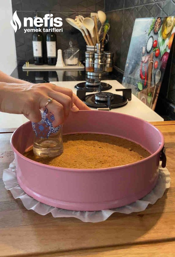 - Yağlı kağıt serdiğimiz kelepçeli kalıba bisküvi karışımını döküp kalıba eşit biçimde yayalım ve uygunca bastırıp pürüzsüz yüzey elde edip buzdolabına kaldıralım.