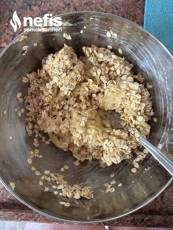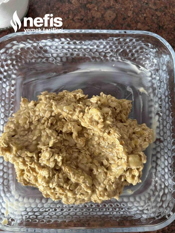 - Olgunlaşmış muzları ezelim, fıstık ezmesini ekleyip, yeterlice karıştıralım. Yulafı da ekleyelim ve tabanı hazırlayalım.