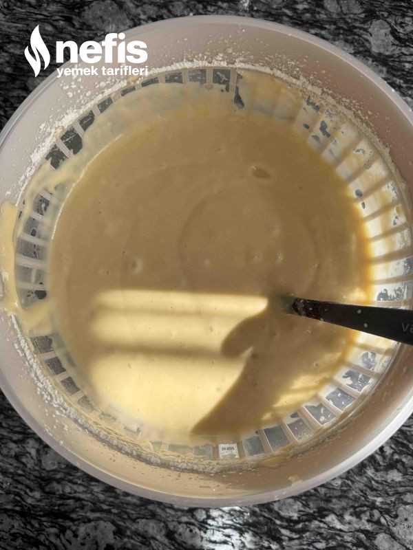 - Ardından sütü ve yağı da ekleyip bir defa çırpalım. Unu ve kabartma tozunu ekleyip kaşık yardımıyla karıştıralım. Un kısmını mikserle çırpmıyoruzki kekin havası gitmesin.