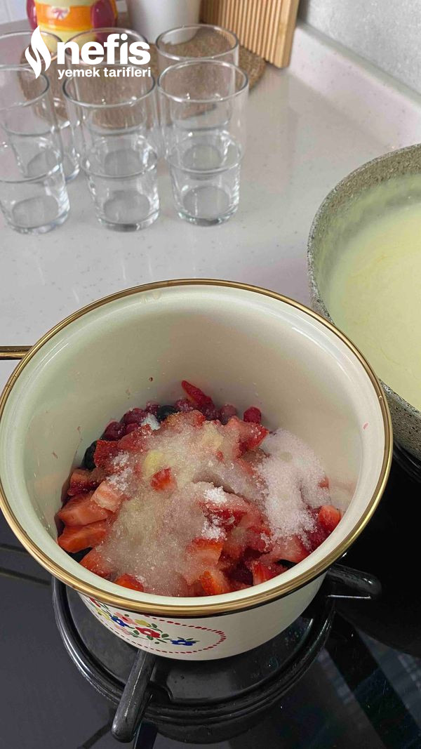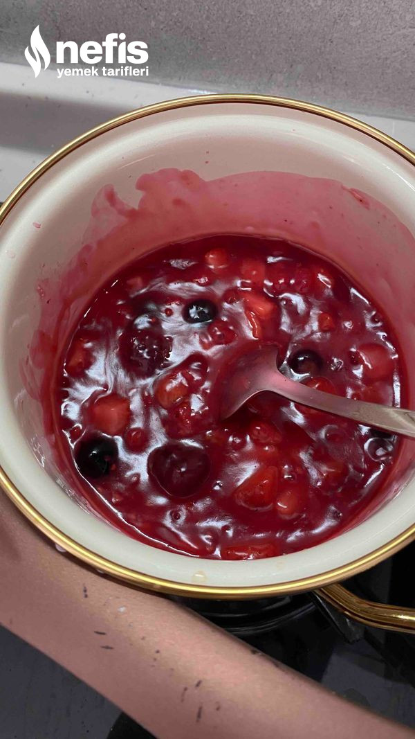 - Daha sonra nişasta su ve şekeri çırpıp hafif ısınan meyvelerin üzerine döküyoruz ,yavaş yavaş karıştırarak meyvelerin formunu bozmadan ezmeden pişiriyoruz kısık ateşte kıvam alınca altını kapatıyoruz.