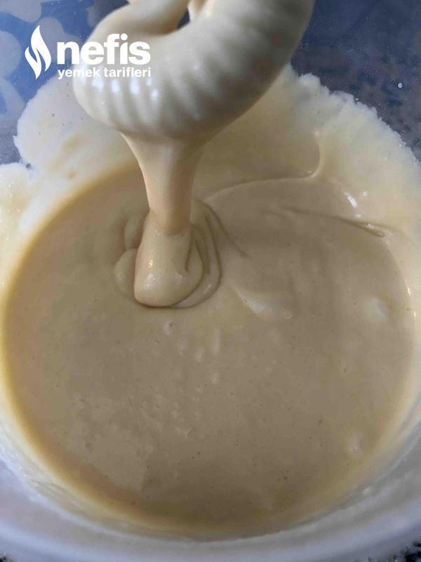 - Büyük bir kaseye yumurtalar kırılır üzerine şeker eklenip çırpılır. Süt, sıvı yağ eklenir ve karıştırılır. Üzerine kabartma tozu vanilya nişasta ve un elenerek eklenir karıştırılır.