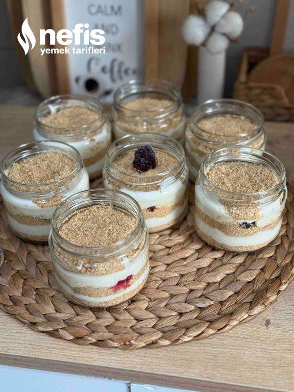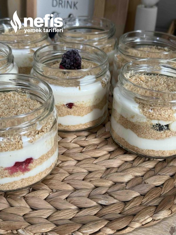 4. Şimdi hepsini tüm malzemeyi birleştirme vakti. Bardakların en alt kısmına, yani tabanına çektiğimiz bisküvilerden 2 yemek kaşığı koyun.