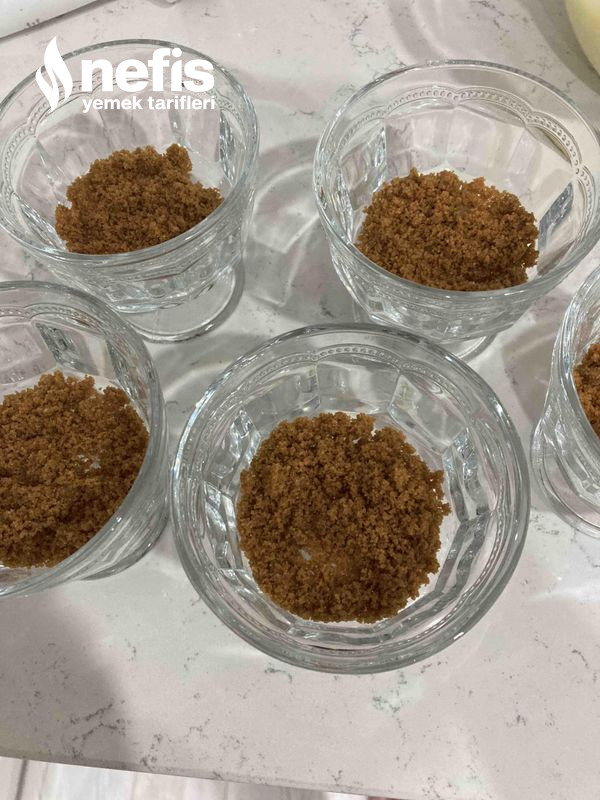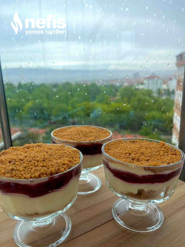 - Kullanacağınız kasenin altına bir kaşık çekilmiş bisküvi yarıya kadar krema üzerine 1 kaşık meyve püresi tekrar krema ve bisküvi ile kaplayın.