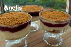 - Kullanacağınız kasenin altına bir kaşık çekilmiş bisküvi yarıya kadar krema üzerine 1 kaşık meyve püresi tekrar krema ve bisküvi ile kaplayın.