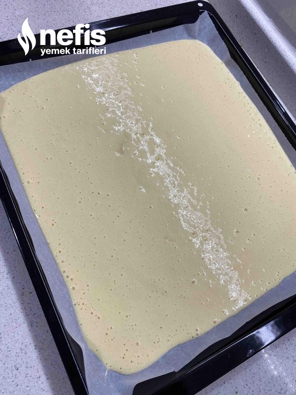 - Un ,kabartma tozu ,vanilya ekleyip yağlı kağıt serilmiş tepsiye döküyoruz.