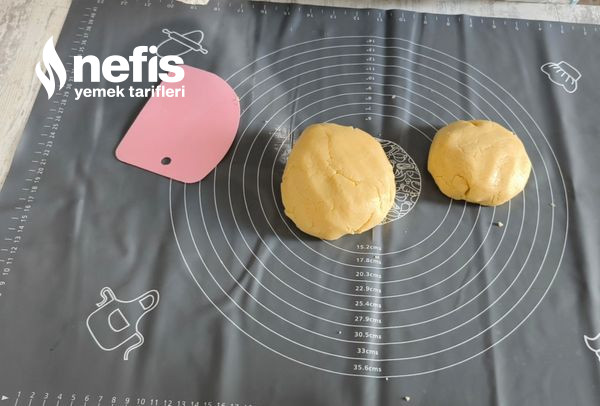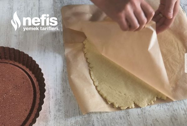 - Hamuru 2 adet yağlı fırın kâğıdın ortasına yerleştirelim ve kullanılacak kalıbın büyüklüğünde açalım.