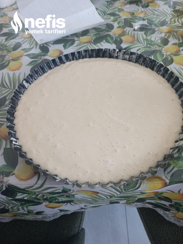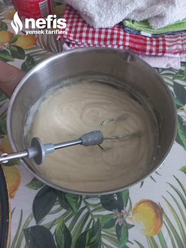 5. Pişen keki fırından alıyoruz ve soğuyan muhallebi ile buluşturuyoruz.