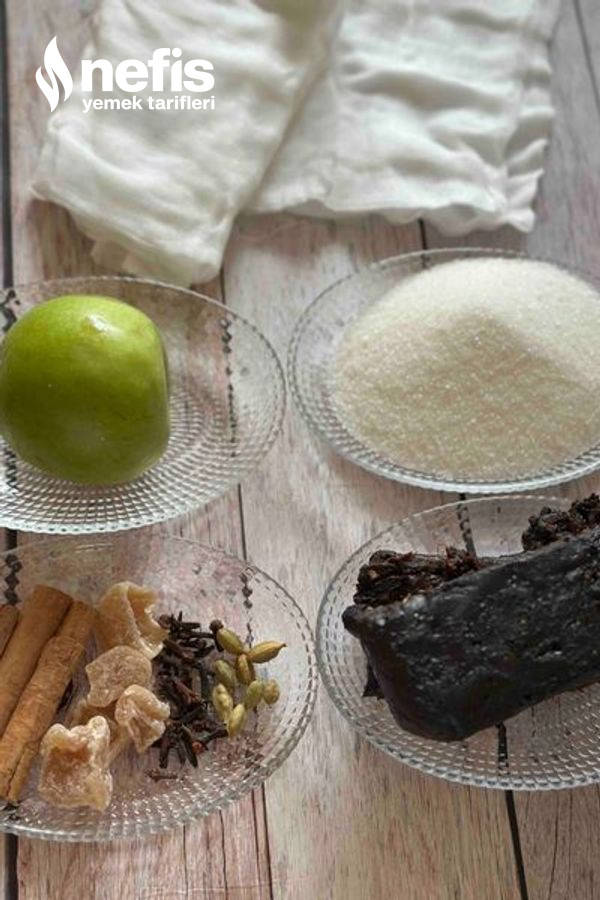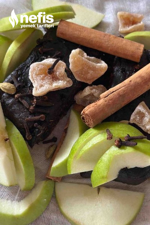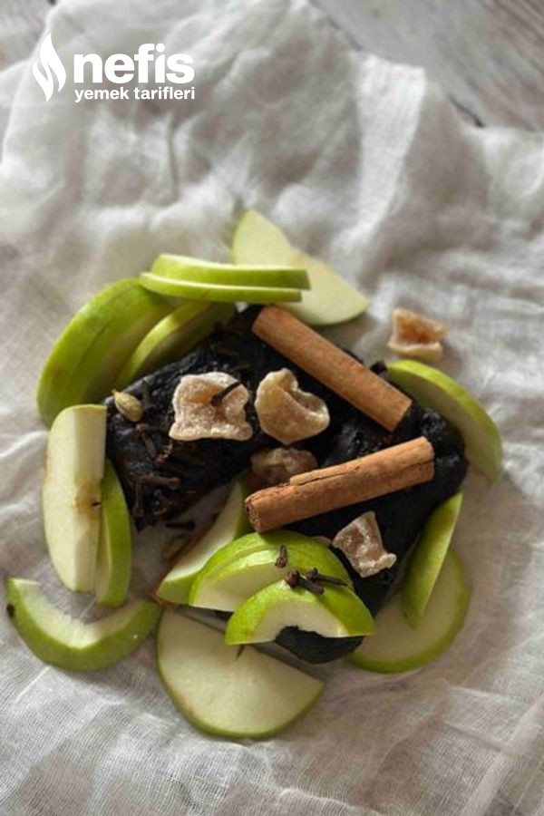 3. Ardından sırayla tarçın, zencefil, karanfil ve ince dilimlenmiş elmaları da ekleyin ve tülbenti sıkıca bağlayın.