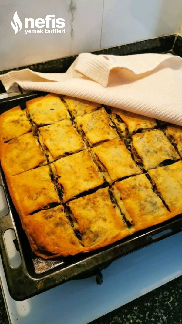 3. Tepsiyi yarım su bardağı zeytinyağıyla yağlıyoruz. Her kata iç harcı atıyoruz en üst hariç. En üst hamurumuzu çokça zeyrinyağıyla yağlayıp dilimliyoruz.