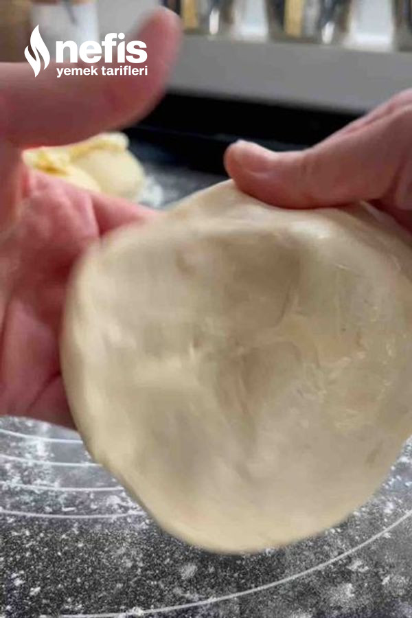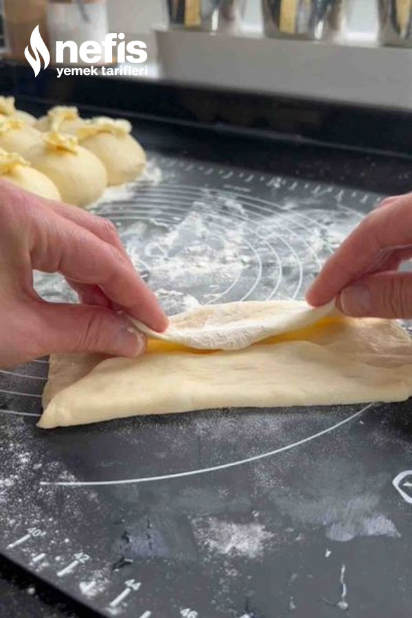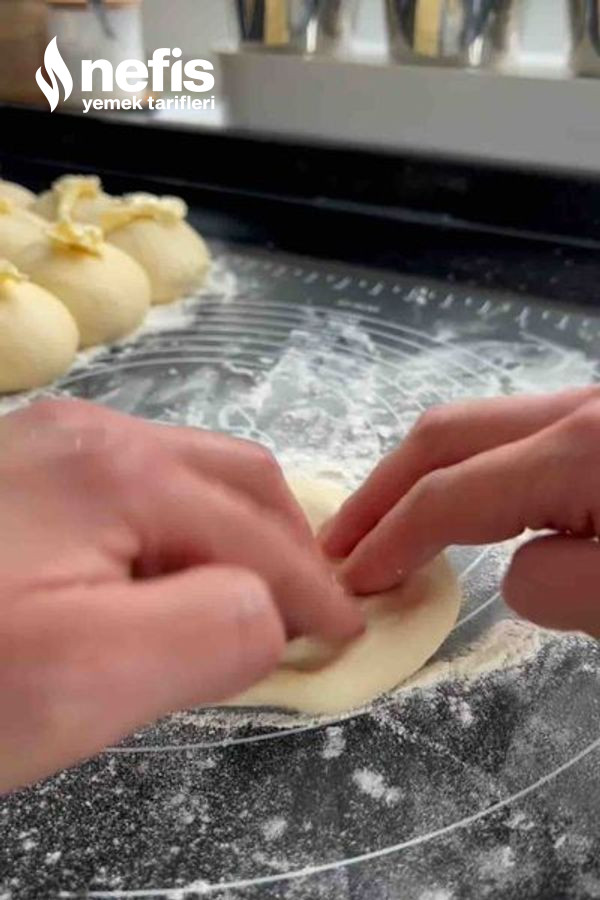 5. Hamurun açılması ve şekillendirilmesi her bir bezeyi elinizle yavaşça bastırarak içerisine bir modül tereyağı koyun ve tabak büyüklüğünde açın.