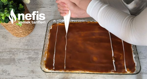 8. Bir kapta kremşantiyi çırpalım 2 kasık kremşanti ayıralım ve keremşanti poşetine koyalım. Kremşantiyi kekin üzerine sürelim ve son olarak karamel sosu her yerine yayalım.