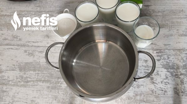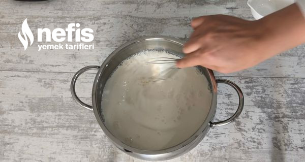 5. Süt şerbeti için; sütü şekeri ve kremayı bir tencerede karıştırıp buz dolabına kaldıralım kek.