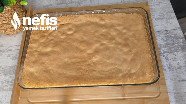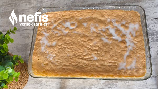 7. Kek pişip soğuduktan sonra kürdan ile delelim ve süt şerbetimizi üzerine dökelim 15 dakika sütü çekmesini bekleyelim.