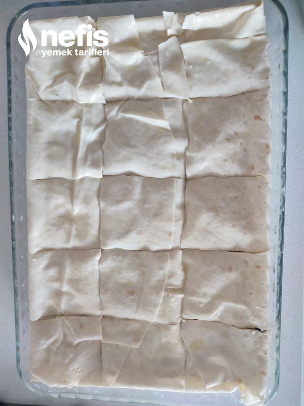 - Dördüncü yufkayı serin ve sos sürün. Birinci serdigimiz yufkanın kenarlarını da tepsiye kapatıp en üstüne kalan sosu döküp yayın.