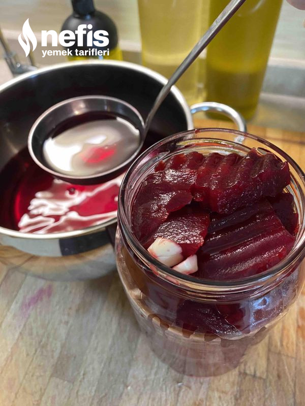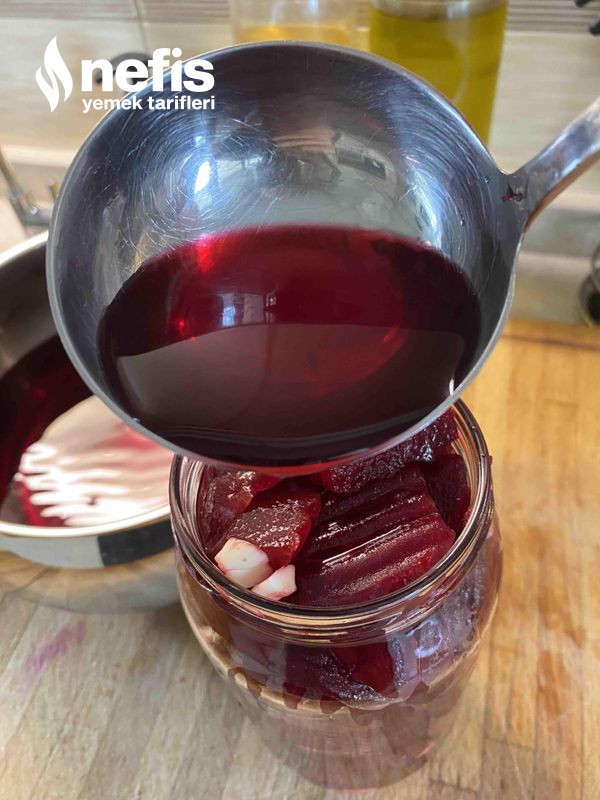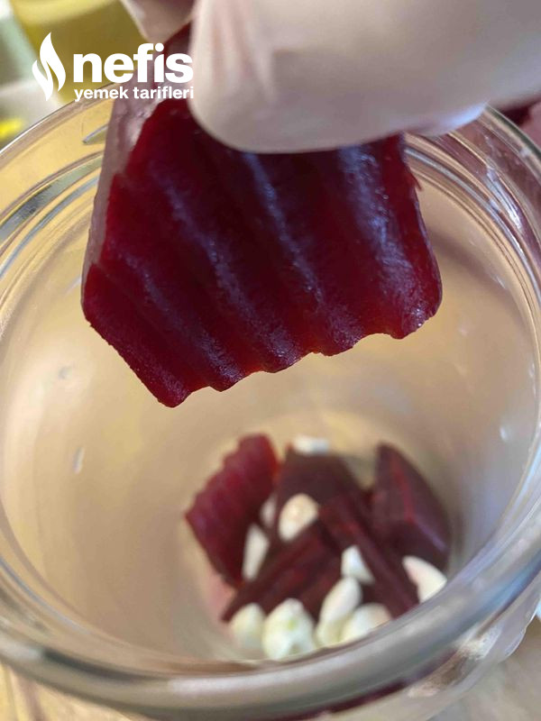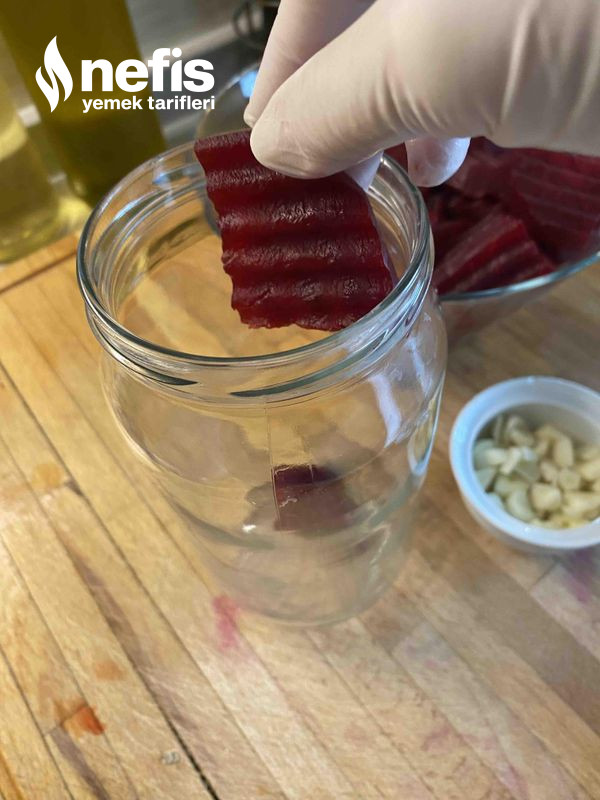 4. Kavanozun içine dilimlenmiş pancarları koyalım, ortalara da sarımsakları koyalım. 7en son turşu suyunu da koyalım ve kapağını 3 geri bir ileri olmak üzere kapatıp soğumaya bırakalım ve buzdolabına koyalım. 1 gün sonra turşumuz hazır olacaktır 👍.