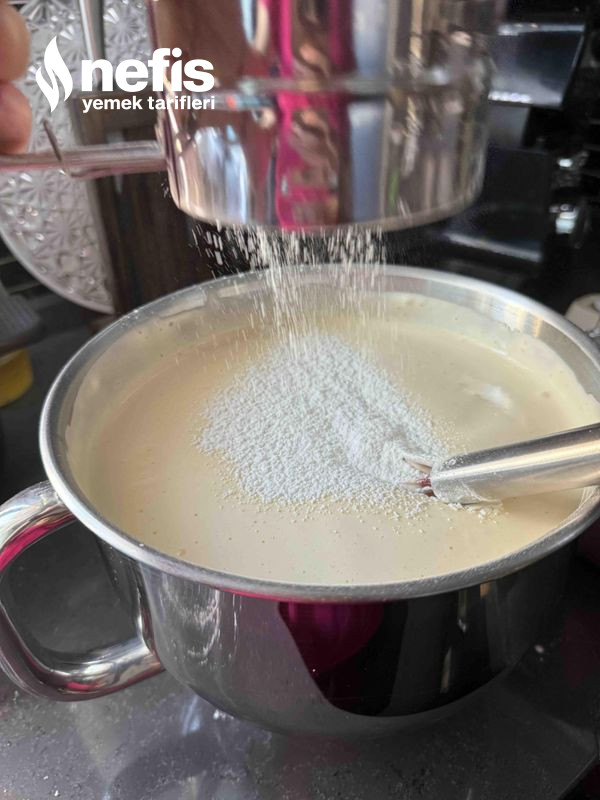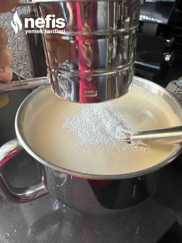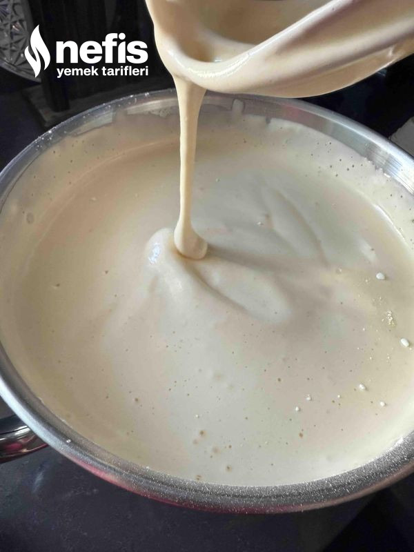- Sarılarını da şekerle biraz çarptıktan sonra yavaş yavaş sıcak suyu ekleyerek rengi açılana kadar çırpın. 3kez elenmiş katı gereçleri de yavaş yavaş ekleyerek karıştırın.