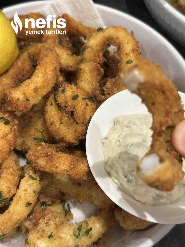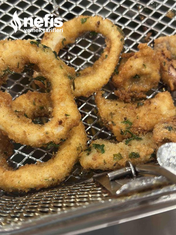 9. Kalamarın üçte birini yağda 1–2 dakika, altın rengi olana kadar kızartın.