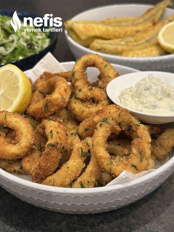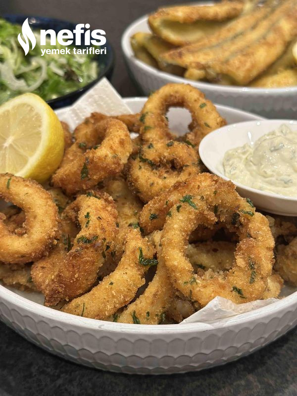 12. Servis: kızarmış kalamarları karışık yeşillikler ve limon dilimleriyle birlikte servis edin. Yanında dilediğiniz bir sos ile sunabilirsiniz, ben tartar sosu ile sundum.