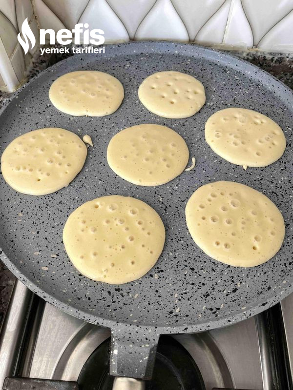 5. Pankek tavamızı orta ateşte ısıtalım, pankek hamurumuzdan bir kaşık tavaya dökelim, birinci kabarmayı gördüğümüz an çabucak çevirelim .