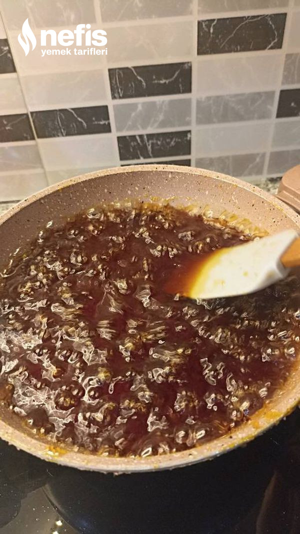 - Diğer bardaktaki soğuk suyla nişastayı karıştırarak açalım su üzere eriyen karamelimizi bağlayalım bir kaç dakika kıvam alana kadar karıştıralım.