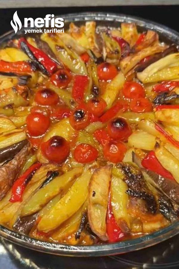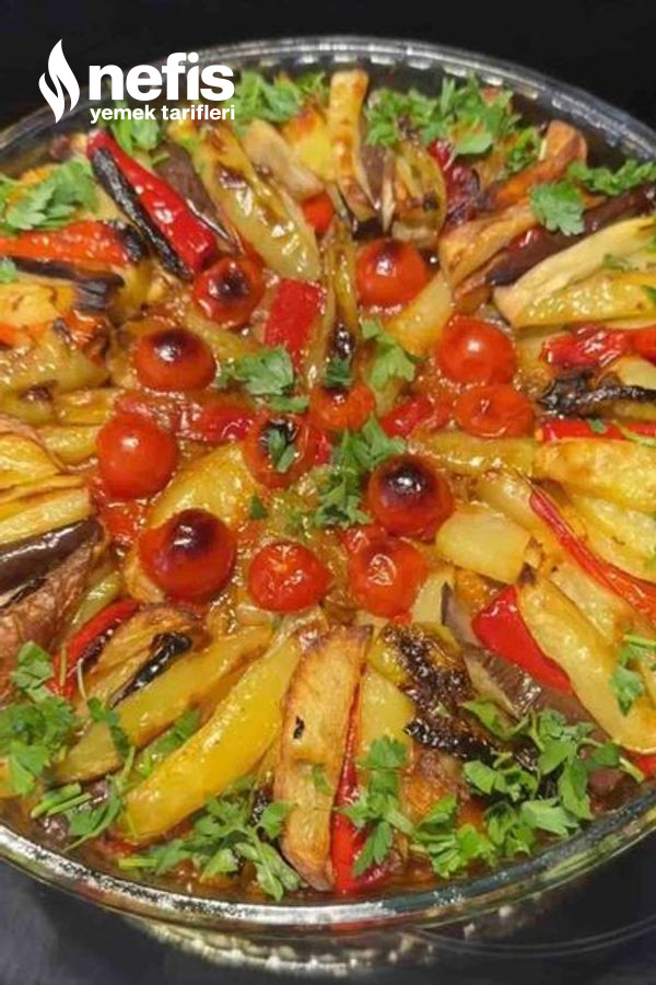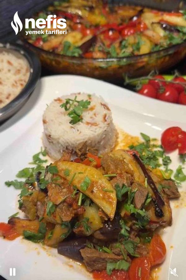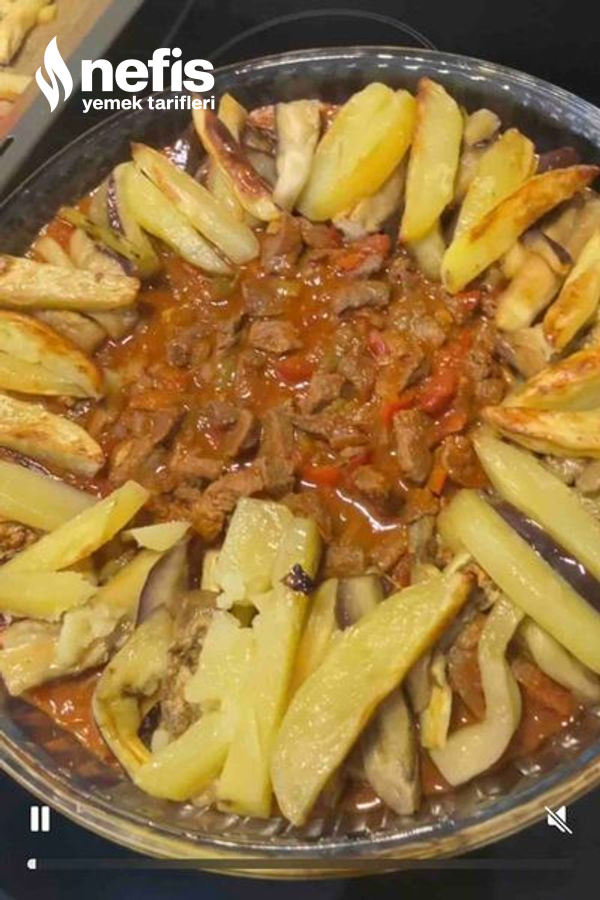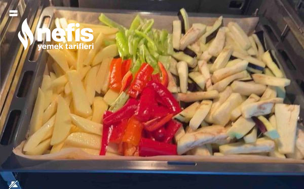 - Fırın kabına pişen etleri ekleyip, kenarına kızarmış, patlıcan, patates ve biberleri dizin.
