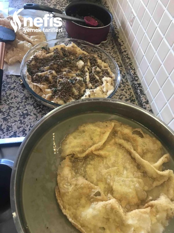 - Kızarmış hamurları kaynayan suyun içine koyup üzerine kaşıkla suyundan alıp üzerine döktüm.