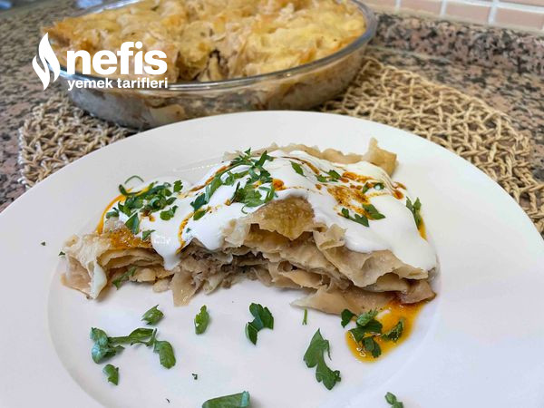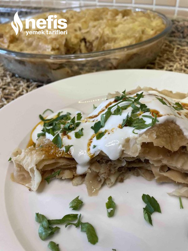 - Hafif yumuşayınca öteki bir tepsiye koyup üzerine kıymalı harcını tekrar hamuru haşlayıp tekrar kıymalı harçtan koyup kat kat formunda hazırladım. 4 adet yufkadan yaptım.