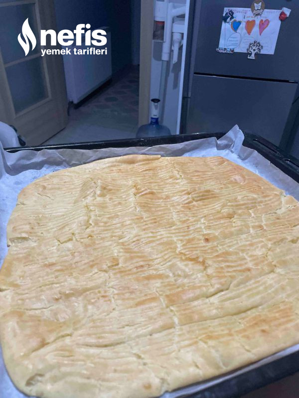 - Hamur hazır olunca kare bir fırın tepsisine çok yaygın olmayacak ve eşit olacak formda dağıtıyoruz, üzerine çatal ile çok bastırmadan şeritler çizip, 180 derece 25-30dk üzeri kızarana kadar pişiriyoruz.