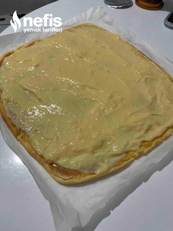 - Hamur fırından çıktıktan sonra oda sıcaklığına gelince öbür bir yağlı kağıdın üzerine aksi çevirip altındaki yağlı kağıdı çıkarıyoruz. Kremayı tüm hamura yayıp yağlı kağıdın yardımıylada güzelce sarıyoruz.
