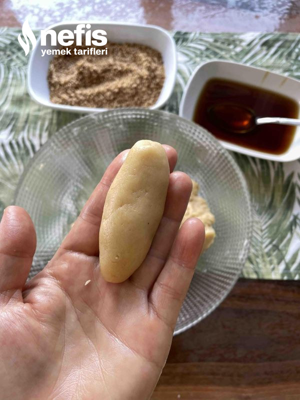3. Hamurdan ceviz büyüklüğünde kesimler koparıp silindir formunu verelim.