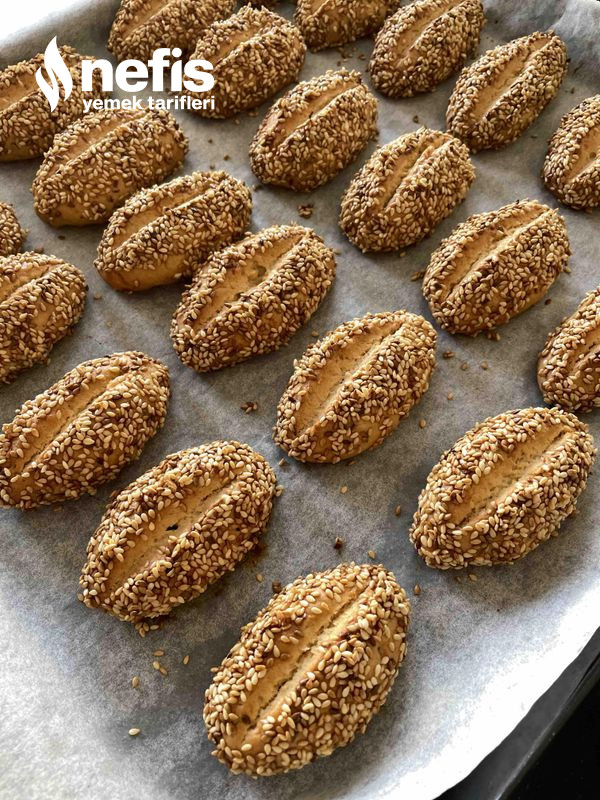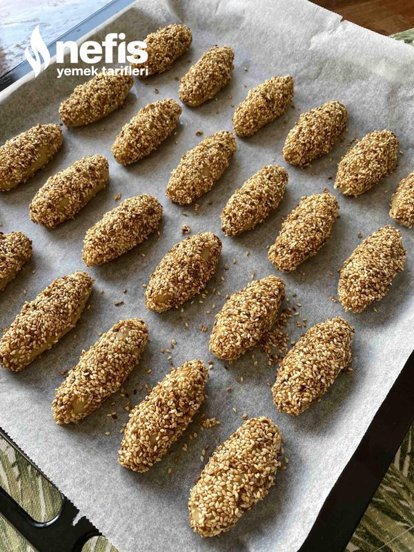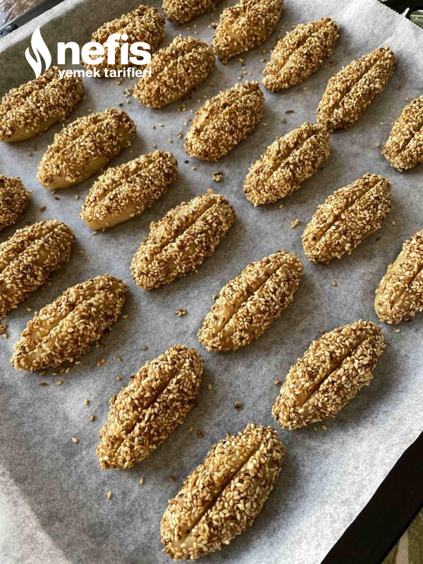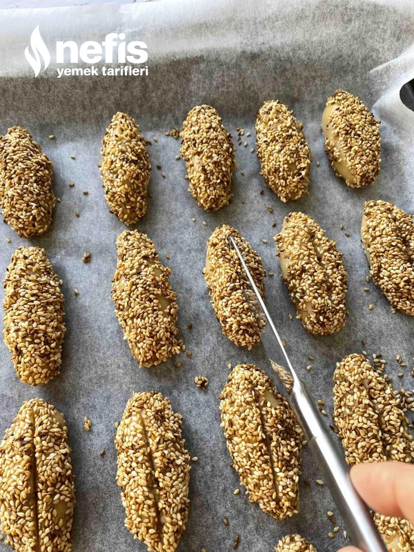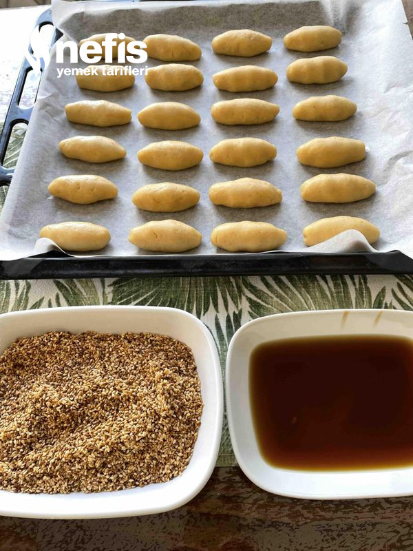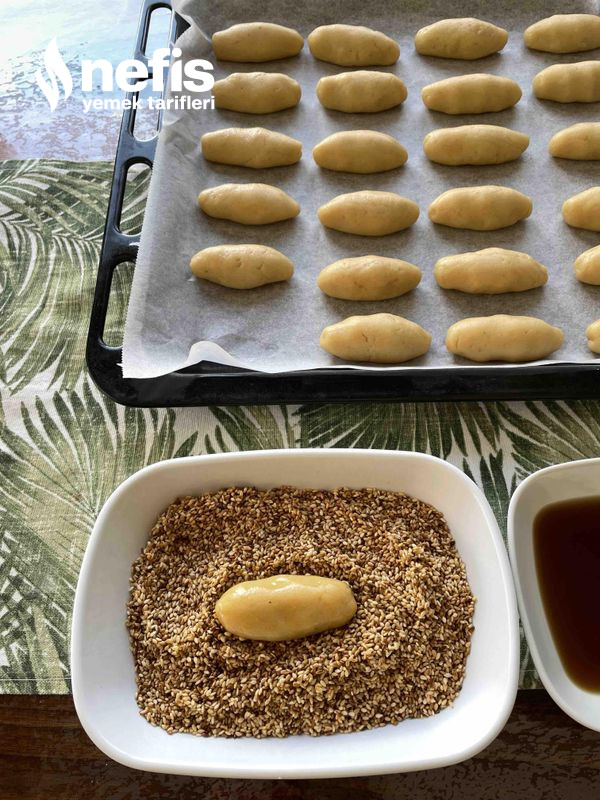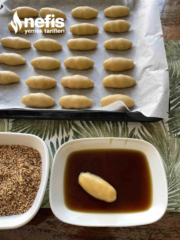 5. Kurabiyelerimizi evvel pekmezli suya daha sonra susama bulayıp yağlı kağıt serdiğimiz tepsiye dizelim.