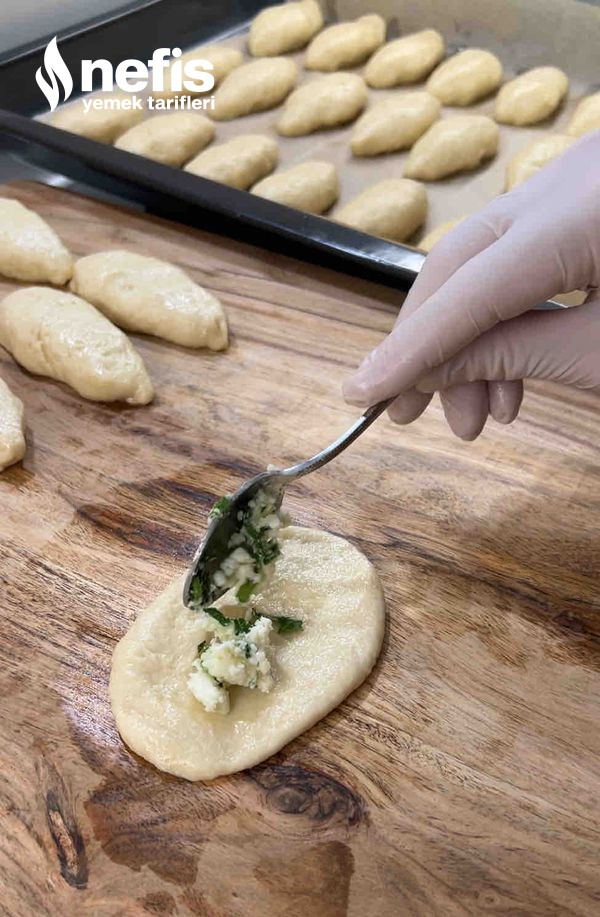 - Hamuru bekletmeden bezelere ayıralım. Ortasına dilediğiniz iç harcından koyup hal verelim.