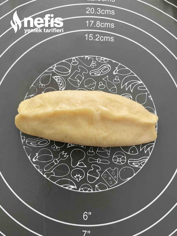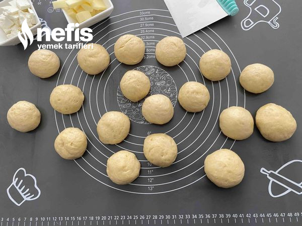 - Hamurumuzu 30 dakika bekletiyoruz. Hazır olan hamurumuzdan yumurta büyüklüğünde bezeler kopartalım ve parmaklarımızın ucu genişletelim.