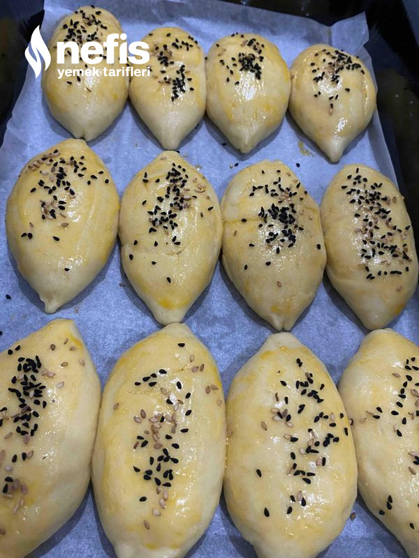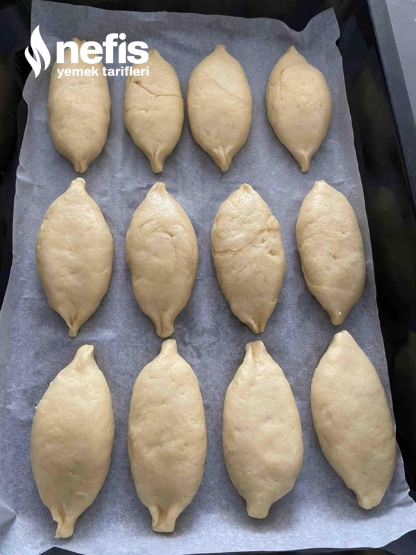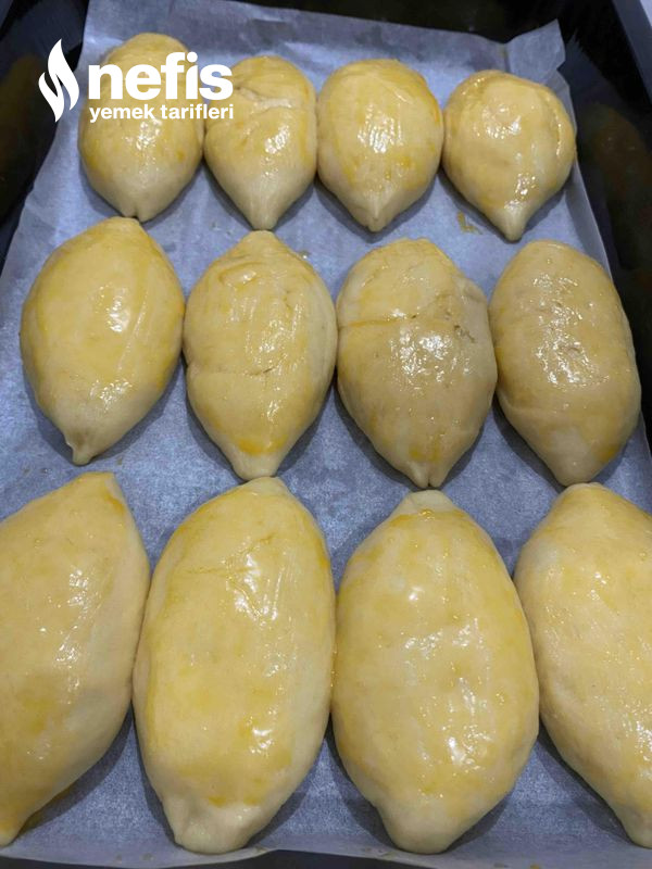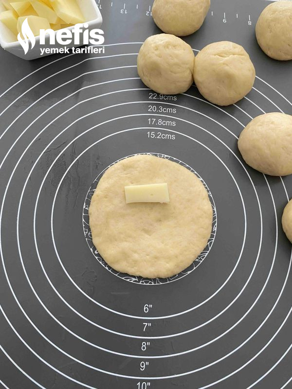 - Hamurumuzun ortasına peynirli iç harcından yerleştirelim. Kaşar peyniri, beyaz peynir ya da farklı iç harcınız varsa onu da kullanabilirsiniz. İç harcını yerleştirdikten sonra iki ucunu kapatarak birleştirelim ve tepsimize yerleştirelim.