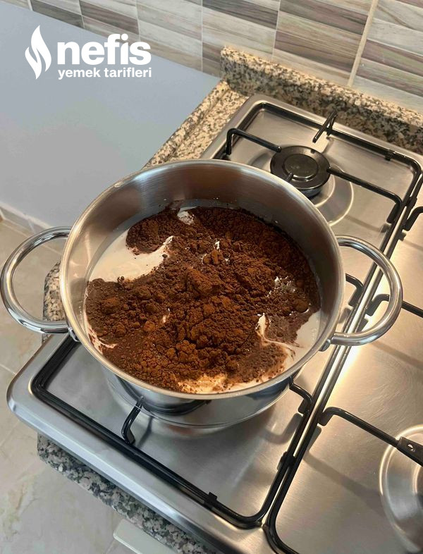 1. Tencereye süt, şeker, kakao, nişasta ve kremayı alın. Çırpıcı ile daima karıştırarak orta ateşte pişirin.
