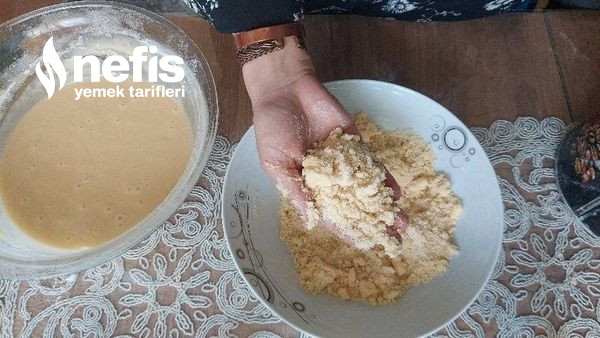 - Buzdolabından aldığımız soğuk tereyağına toz şeker ve un ek edelim elimize ovuşturarak umaç haline getirelim.