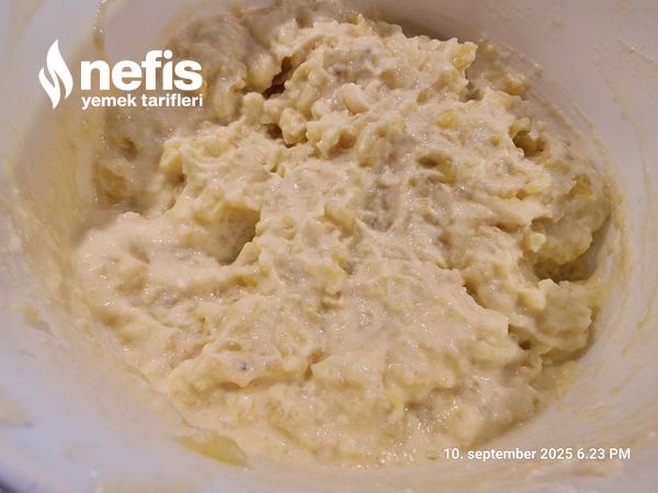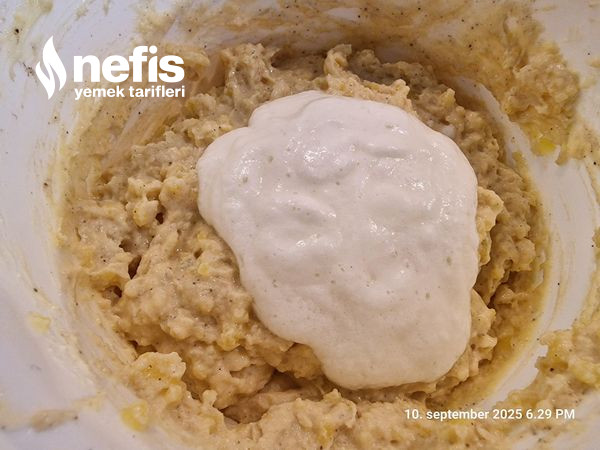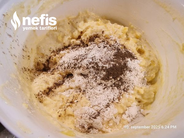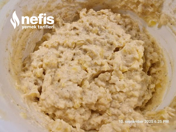 2. Un, kabartma tozu, tuz ve karabiber karıştırılarak patates karışımına eklenir ve karıştırılır.