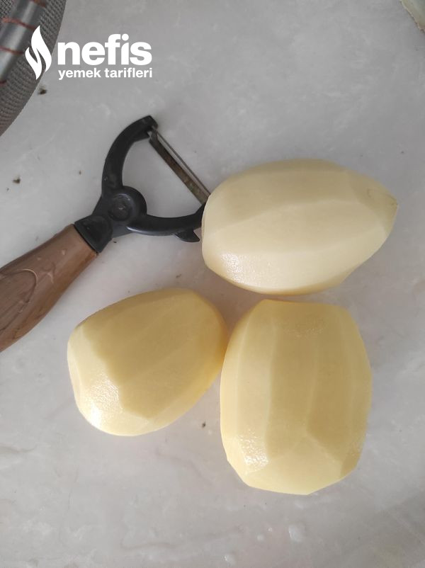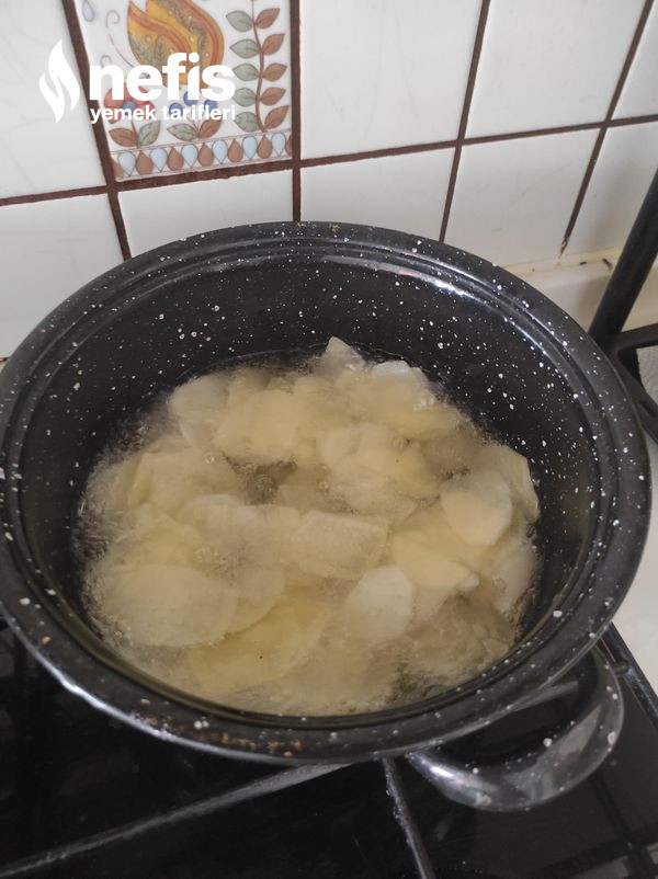1. Patatesleri soyma bıçağı ile ince ince dilimleyip nişastası gitsin diye suda yıkıyoruz.