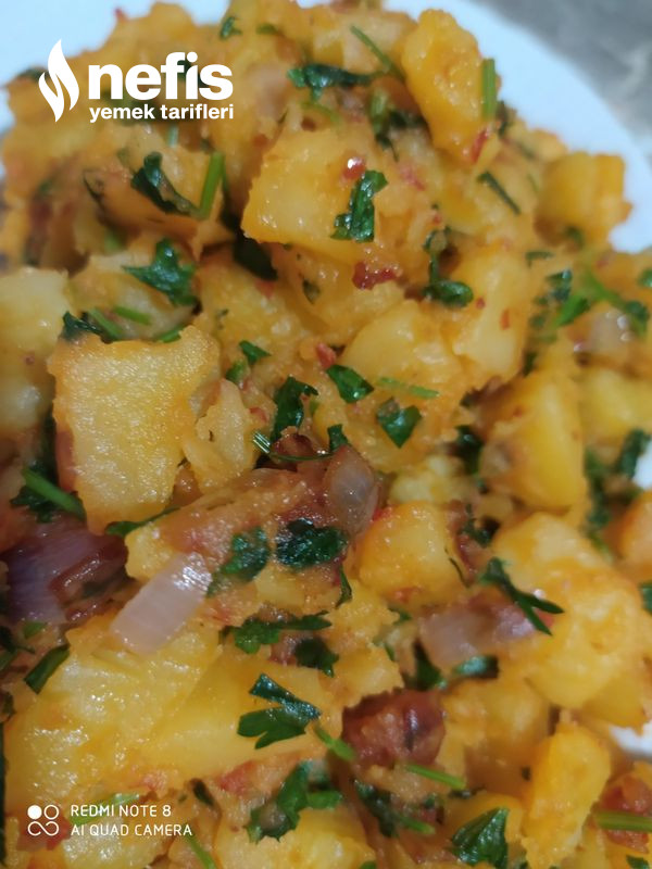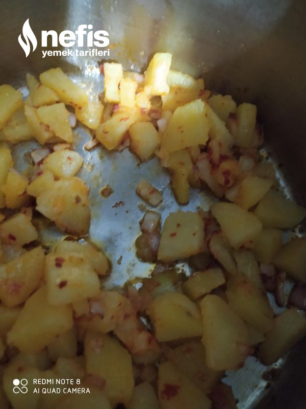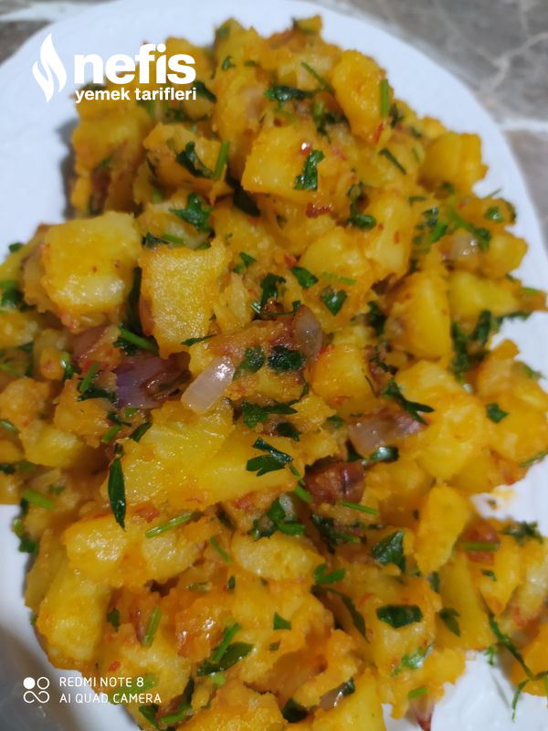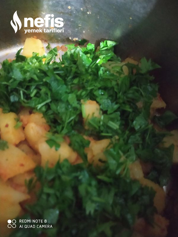 - Haşlanmış patatesleri gelişi hoş doğrayıp içine koyalım, tuzunu ekleyelim ve maydanozu doğrayıp içine koyalım bir kaç dakika piştikten sonra servis edelim.