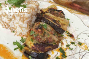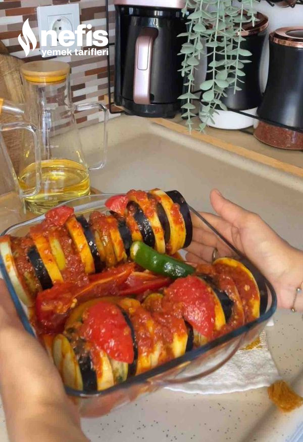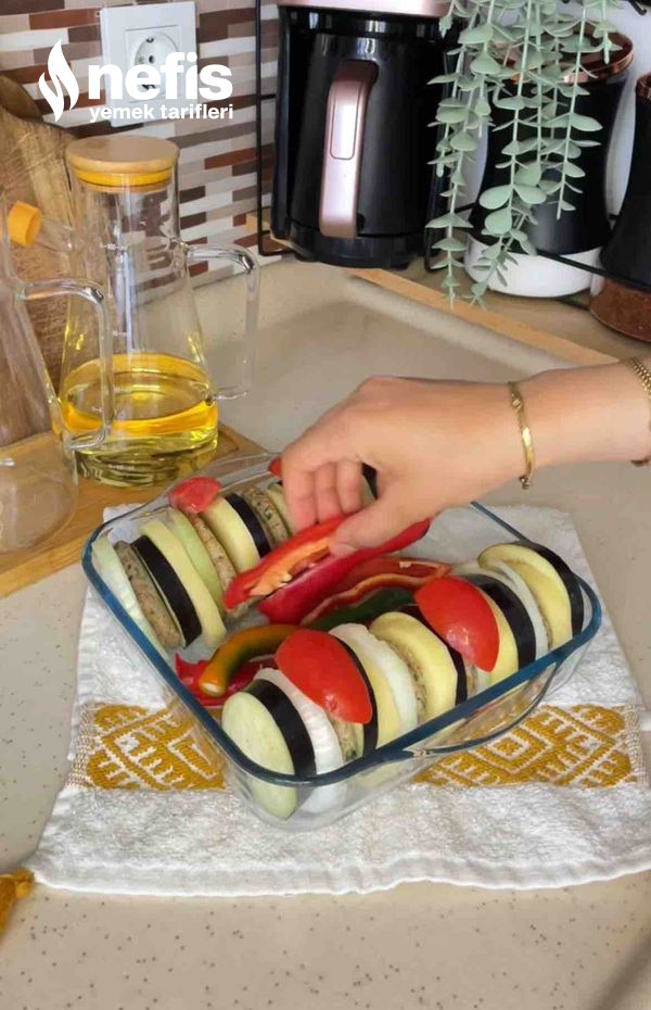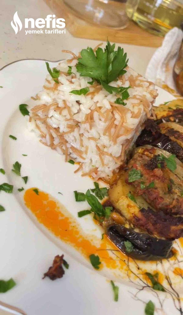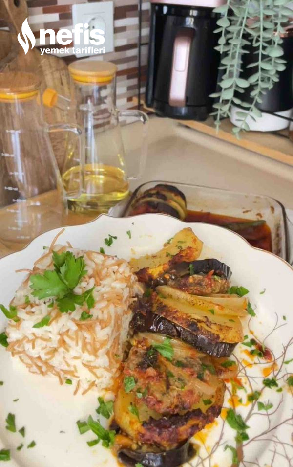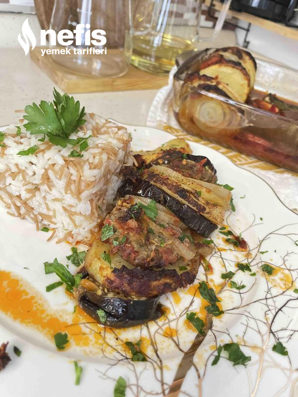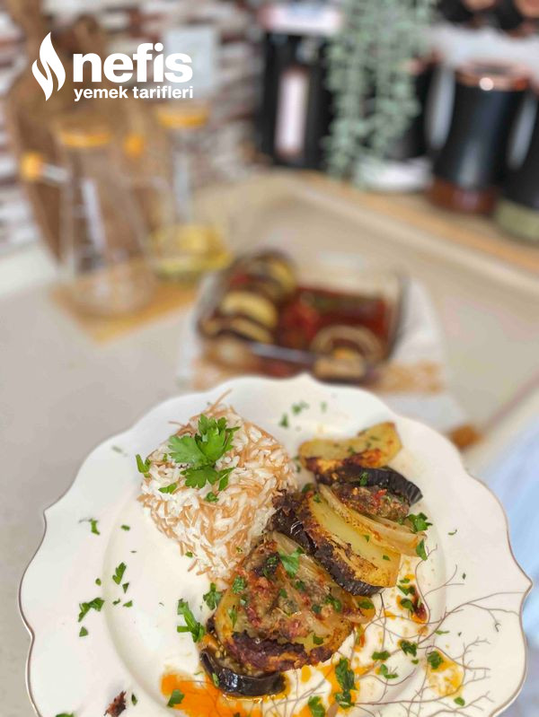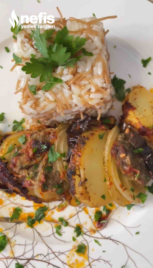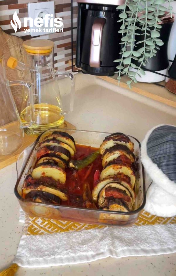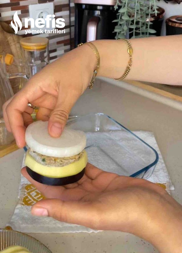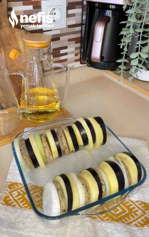 6. İnce olmasın, kalına yakın olsun. Borcama bir patlıcan patates et soğan olacak formda diziyorum.