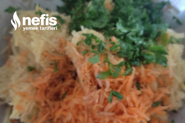 1. Patatesleri ve havucu yıkayıp temizledikten sonra rendenin ince tarafıyla rendeliyoruz.