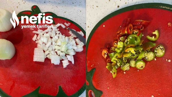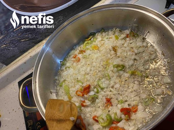 1. Soğanları küp küp doğrayıp üzerine sıvı yağ koyup kavuralım tam solmadan doğradığımız taze biberleri de koyup yeterlice solduralı.