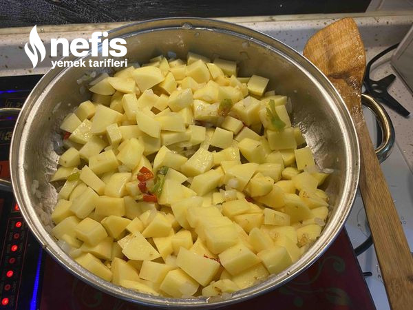 2. Kavrulan soğanın üzerine küp küp doğranmış patatesleri koyup birkaç kere kavuralım.