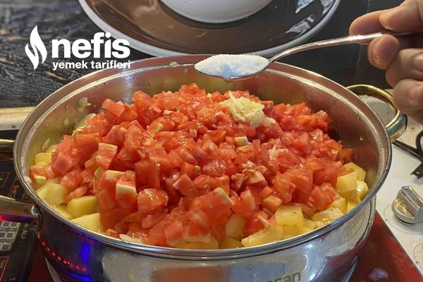 3. Kavrulan patatesin üzerine domatesi ekleyelim üzerine tuz kimyon ve sarımsağı ekleyelim.
