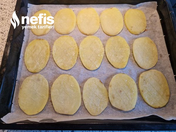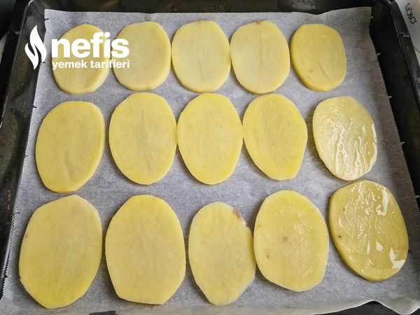 1. 3 adet patates soyularak ince dilimlenir ve kağıt serili tepsiye dizilerek bıçak yardımı ile çizikler atılır.