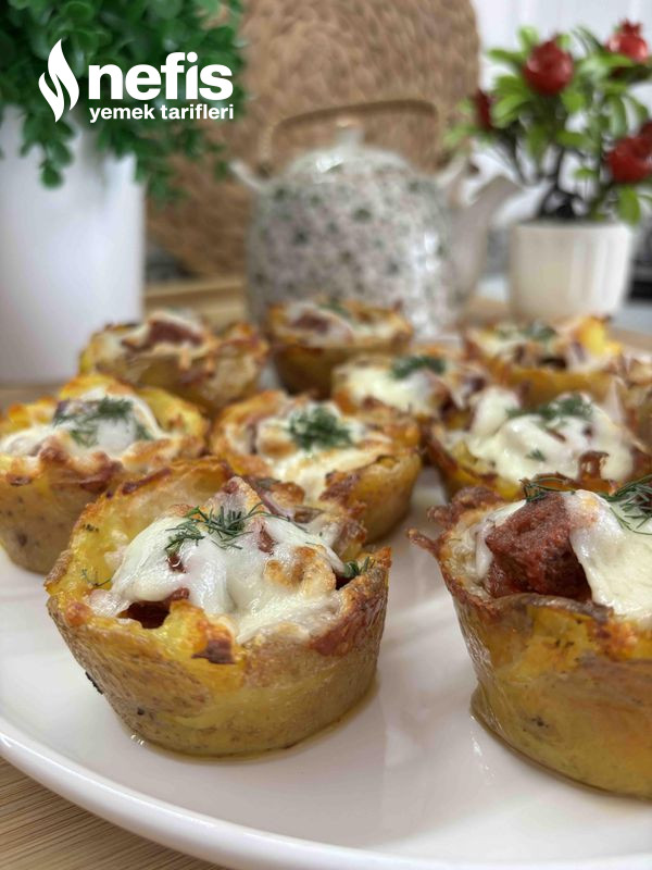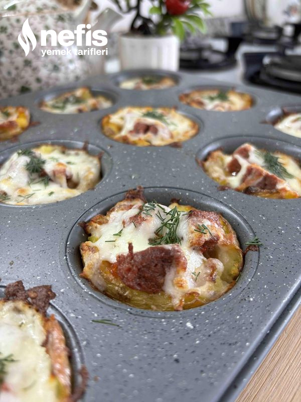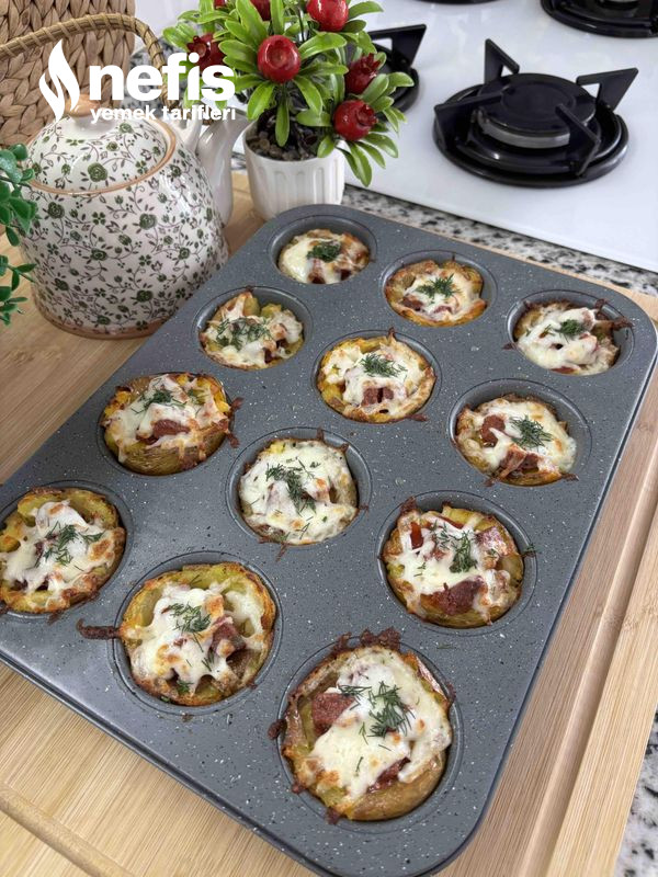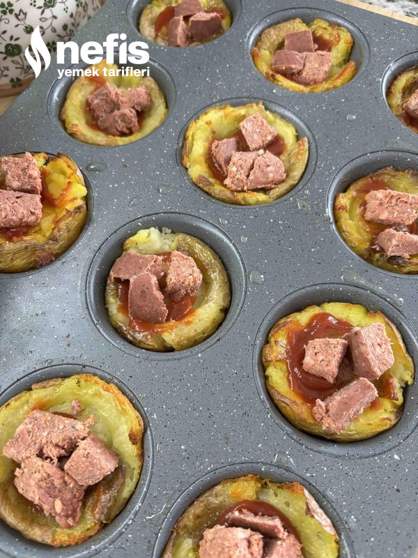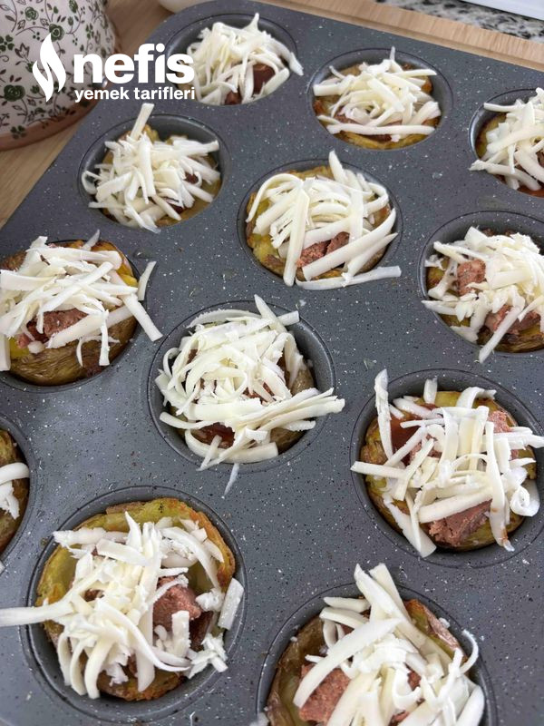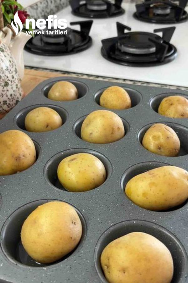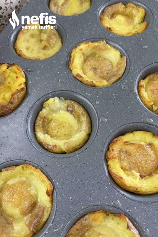 - Yağladığınız muffin kaplarına patatesleri yerleştirip üzerine tabanı yağlanmış çay bardağı ile bastırın. Sonra her birine tuz serpin.