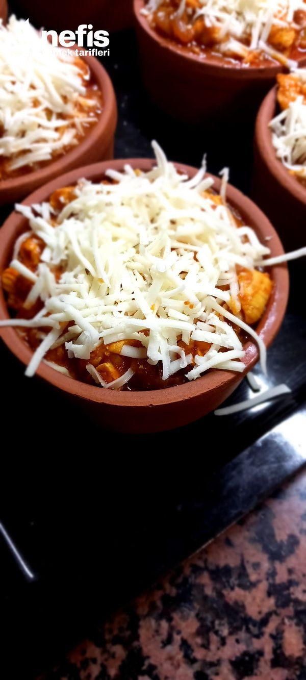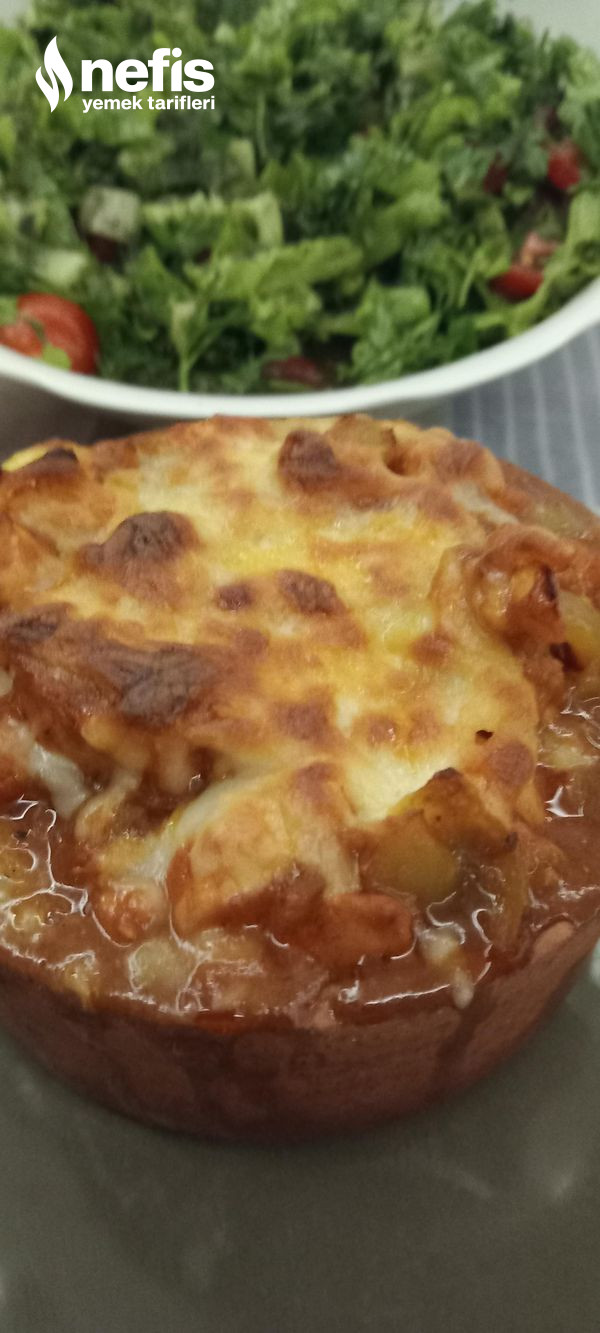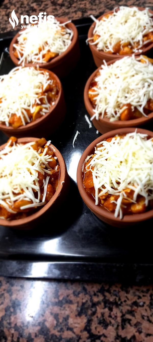 - Şimdi 1 kişilik güveçlere evvel püre, üzerine sote ve en son rendelenmiş kaşa koyalım.