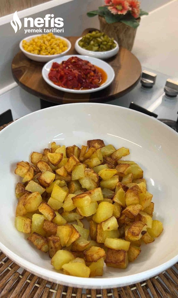 - Patatesleri doğrayıp kızartalım. Servis tabağına alalım. Kapya biberleri ister sence doğrayıp soteleyin ister közleyin.